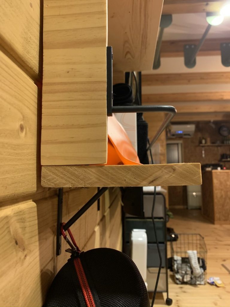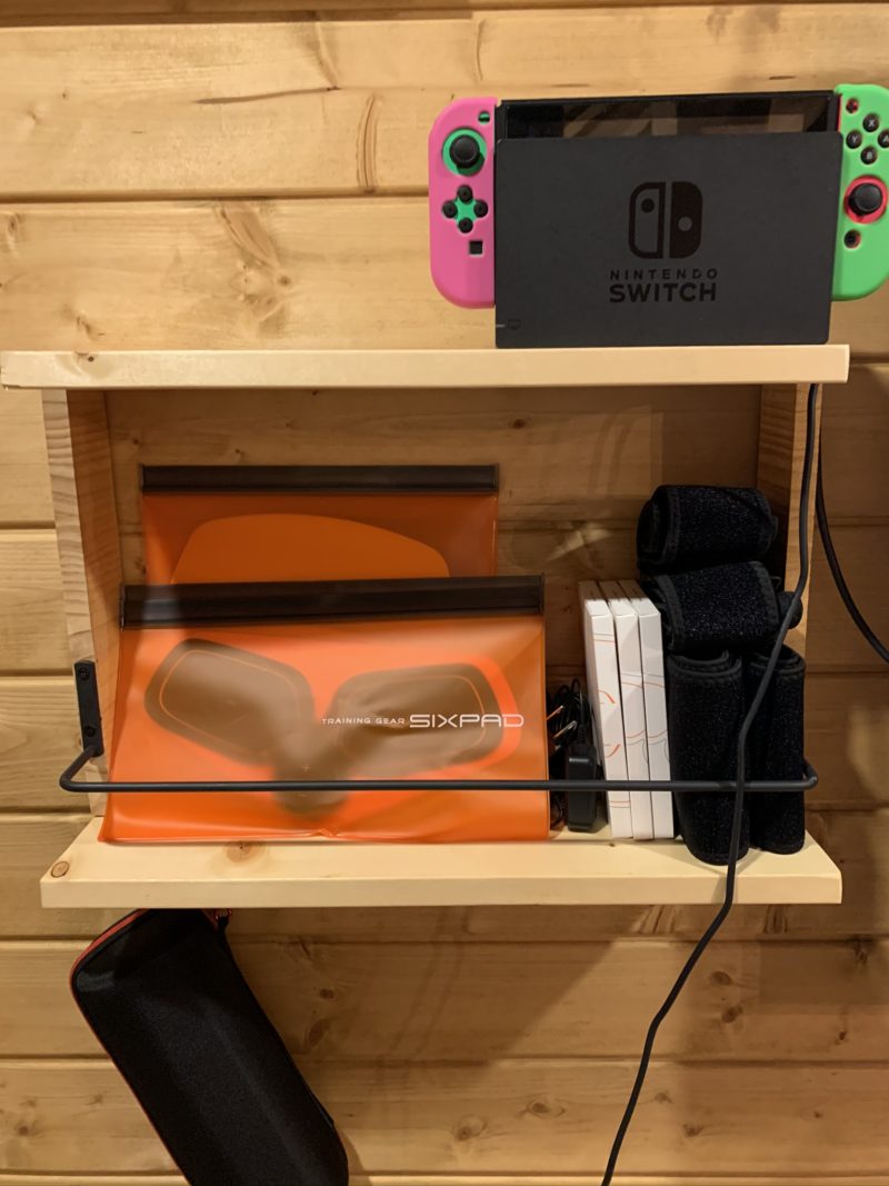 私は、任天堂スイッチと腹筋を鍛えるためのシックスパットをよく使うので、使いやすいところに収納したいと考え、今回の壁掛け棚を作りました。